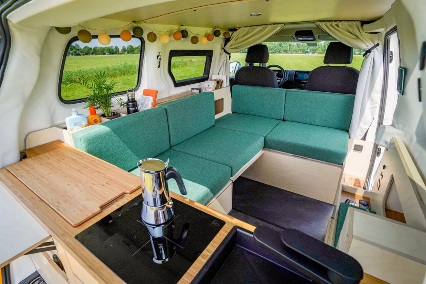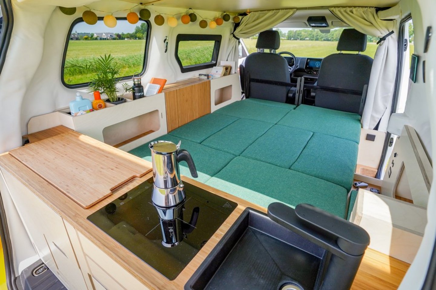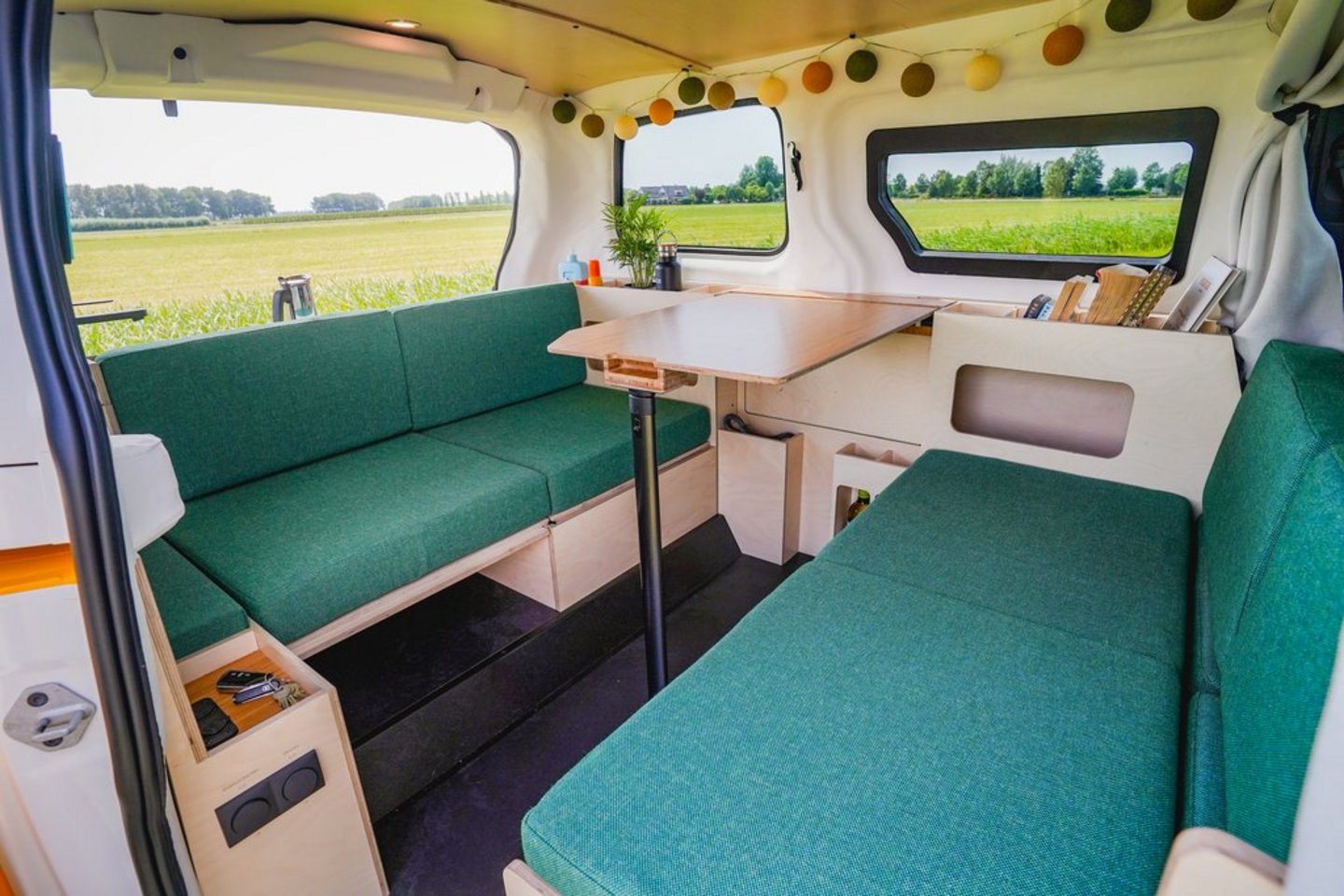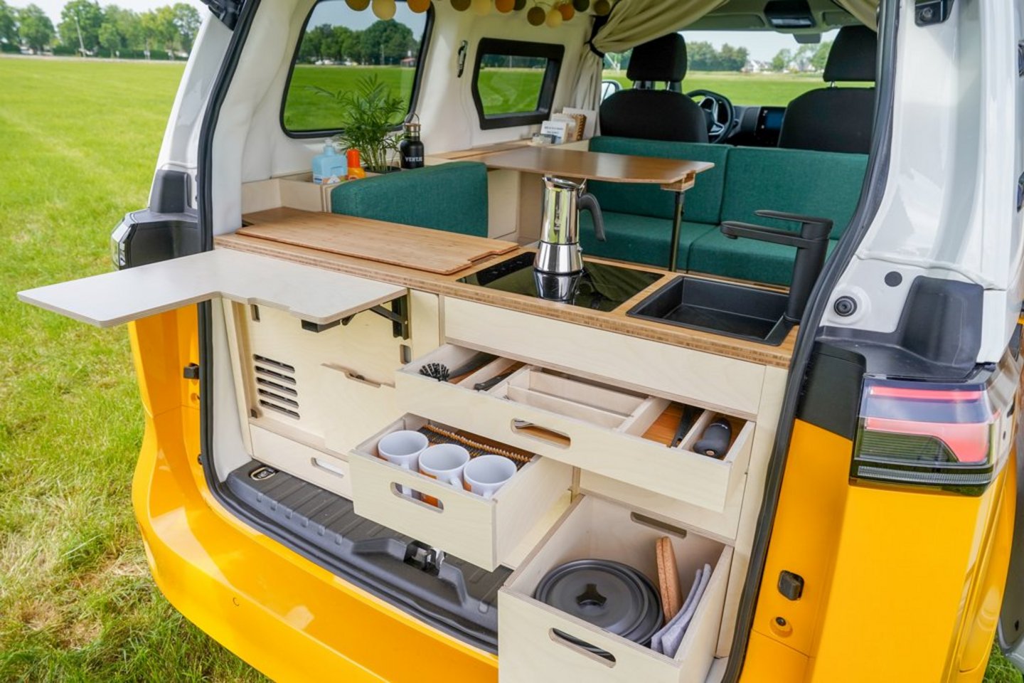 Die viersitzige Sitzgruppe mit Tisch lässt sich über ein Loungesofa bis hin zum Bett (Liegefläche 200 x 149 cm) umbauen, das von der Küche bis zu den Vordersitzlehnen reicht. Sicherheitsgurte gibt es aktuell nur vorne, an Gurten für zwei rückwärtige Passagiere arbeiten die Niederländer gerade. In einer schmalen Schublade kommt eine komplette Outdoor-Garnitur mit zwei Hockern und Tisch unter. Außerdem sind, neben diversen Staufächern, Steckdosen und USB-C-Anschlüsse verfügbar.